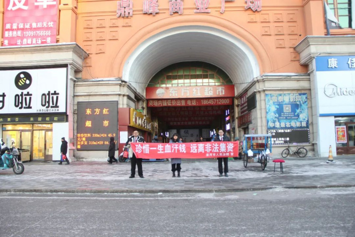 为深入贯彻落实《防范和处置非法集资条例》、《黑龙江省防范和处置非法集资工作实施细则(试行)》,建立健全防范非法集资宣传教育长效机制,漠河市人民法院在春节前,利用岁末年初“万家团聚、万众返乡”的有利时机,深入鼎峰商业广场商圈开展防范和处置非法集资宣传活动。