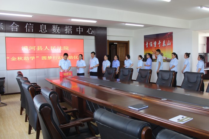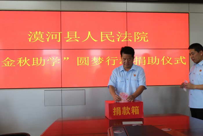 7月26日,漠河县人民法院举行“金秋助学”圆梦行动捐助仪式,活动现场院党组书记、院长刘军身先士卒,带头捐款,院领导和广大干警积极响应,全院40余名干警依次向捐款箱内投下一片爱心,共捐款2370元。