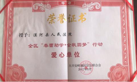 9月1日,漠河县妇联举行“春蕾助学 金秋圆梦”助学金发放仪式,漠河县人民法院作为捐款优秀单位,受到了大兴安岭地区妇女联合会的表彰。