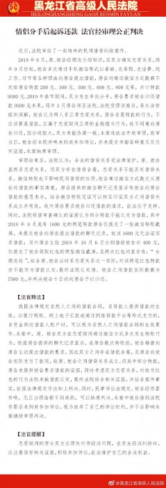 原、被告恋爱时,被告多次通过微信以各种理由提出借钱,原告均微信转款。分手后,原告要求归还、未果,诉至法院。法院调解不成,遂开庭审理,认为双方部分转账存在借贷合意、认定为民间借贷关系,判决被告十日内向原告予以归还。