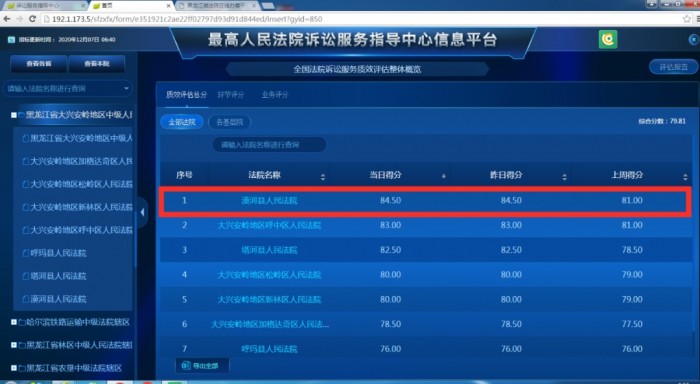 根据最高人民法院诉讼服务指导中心信息平台最新反馈的信息,截止12月7日,漠河市人民法院现代化诉讼服务体系建设质效为84.5分,位居大兴安岭地区第1名,黑龙江省159个法院排名第6名,全国排名第47名!