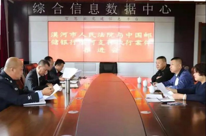 漠河市人民法院与中国邮政储蓄银行漠河支行召开执行系列案件推进会。会议由漠河市人民法院党组书记、副院长、代院长王大伟主持,中国邮政储蓄银行漠河支行党支部书记、行长王海涛应邀出席,漠河市人民法院党组成员、执行局长刘景坤及执行局部分干警参加会议。