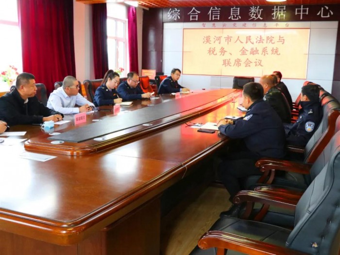 近日,漠河市人民法院组织召开涉税务、银行系统执行案件联席工作会议。会议由漠河市人民法院党组书记、代院长王大伟主持,国家税务总局漠河市税务局党委书记、局长张历程,中国邮政储蓄银行漠河支行党支部书记、行长王海涛,漠河农村商业银行行长助理贾久强应邀出席,执行局部分干警参加会议。