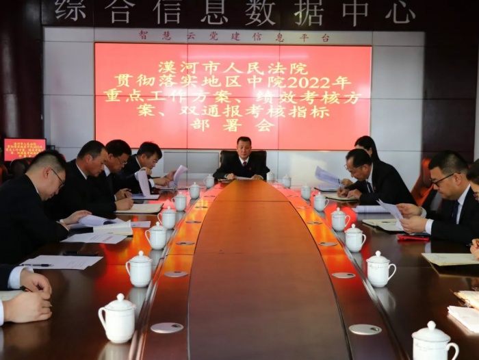 漠河市人民法院召开2022年工作安排部署会议。会议对《大兴安岭地区中级人民法院对各基层法院2022年度主要工作绩效考核方案(暂行)》、《2022年推进五项重点工作实施方案》的通知内容及方案细则、重点等进行了深入的研究学习,通报了2021年全省各中基层法院主要工作情况、2021年全省法官主要工作情况。同时,王大伟院长带领各部门负责人对当前形势及2022年各项重点工作进行了细致分析与安排部署。